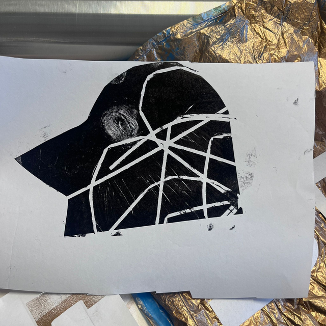 Par exemple : imprimer sur du tissu plié, un sac plastique, des plantes, gratter la plaque... Si vous n'avez pas envie de dessiner, ce n'est pas grave !